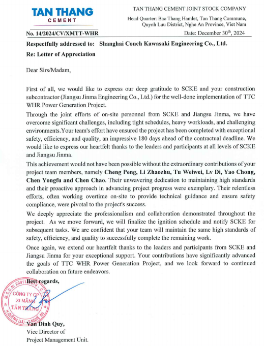 越南項目業(yè)主向海川工程公司發(fā)來(lái)感謝信