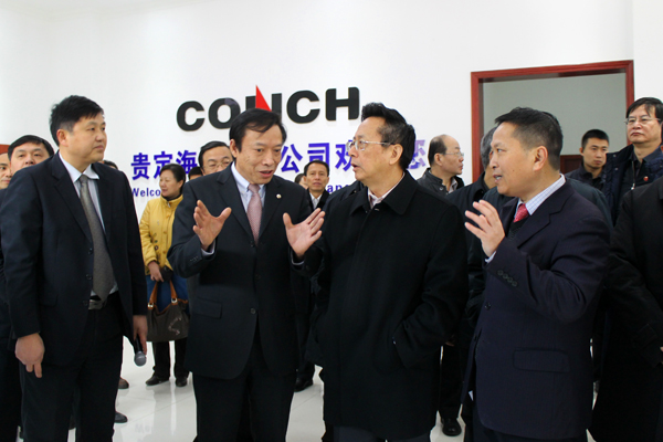 ? ? 海螺創(chuàng )業(yè)總經(jīng)理紀勤應、副總經(jīng)理李大明、公司秘書(shū)疏茂及業(yè)主單位海螺水泥貴州區域有關(guān)負責人熱情接待了陳昌智副委員長(cháng)一行。