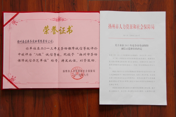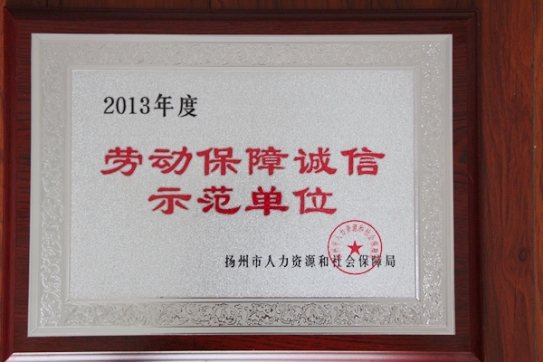 揚州海昌榮獲揚州市“2013年度勞動(dòng)保障誠信示范單位” 榮譽(yù)稱(chēng)號