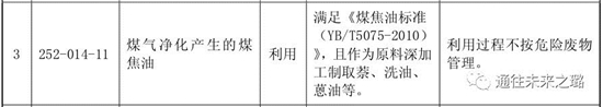 ? ? 以煤氣凈化產(chǎn)生的煤焦油為例,如果滿(mǎn)足《煤焦油標準(YB/T5075-2010)》,且作為原料深加工制取萘、洗油、蒽油等,利用過(guò)程就不按危險廢物管理。