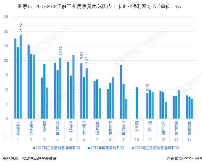 ? ? 具體來(lái)看,2018前三季度,啟迪桑德的凈利潤為8.85億元,同比增長(cháng)5.4%;排在第二和第三位的興蓉環(huán)境和瀚藍環(huán)境的凈利潤分別較上年同期上漲了15.4%和27.6%。凈利潤增速最快的企業(yè)為國禎環(huán)保(121.8%)和博世科(113.6%);興源環(huán)境的凈利潤同比下滑了70.3%。