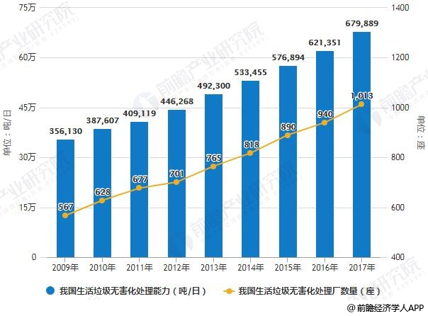 ? ? 垃圾產(chǎn)量與清運量的不斷增加,給生活垃圾處理帶來(lái)了新的挑戰。據前瞻產(chǎn)業(yè)研究院發(fā)布的《中國生活垃圾處理行業(yè)發(fā)展前景與投資預測分析報告》統計數據顯示,2009-2017年,我國生活垃圾處理能力以及處理量不斷提升。2009年,我國生活垃圾無(wú)害化處理能力為35.61萬(wàn)噸/日,擁有生活垃圾無(wú)害化處理廠(chǎng)567座。截止至到2017年,我國生活垃圾無(wú)害化處理能力達到67.99萬(wàn)噸/日,擁有生活垃圾無(wú)害化處理廠(chǎng)1013座。