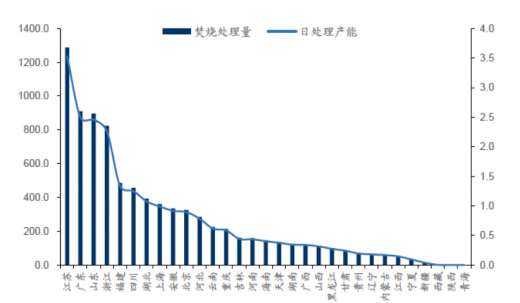 2017年全國各省生活垃圾焚燒量(萬(wàn)噸)及日處理產(chǎn)能(萬(wàn)噸/日)