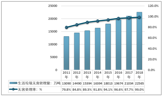 ? ? 最巨大的環(huán)保需求拉動(dòng)下,國內生活垃圾處理行業(yè)出現同步增長(cháng)。較2011年全國79.8%的無(wú)害處理率,中國生活垃圾無(wú)害處理行業(yè)取得令人矚目的成績(jì)。2018年全國生活垃圾無(wú)害處理量達到22565萬(wàn)噸,無(wú)害處理率達到99%。