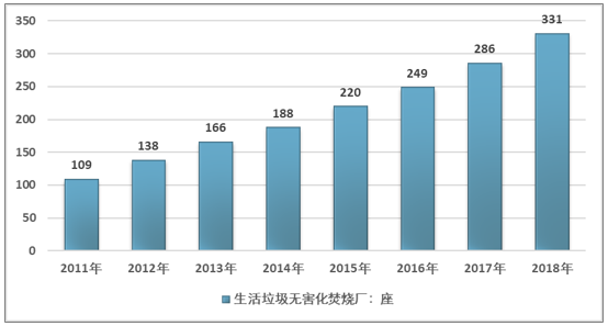 我國生活垃圾無(wú)害化焚燒處理廠(chǎng)家數由 2011年109家,增長(cháng)至 2018 年 331 家,年均復合增長(cháng)率達到 17.2%。