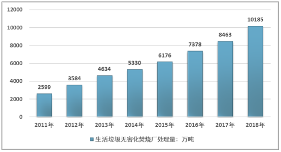 2011-2018年中國生活垃圾無(wú)害焚燒廠(chǎng)處理規模
