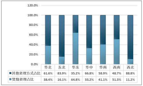 ? ? 從區域情況看,各地區焚燒處理方式利用情況差異性較大。經(jīng)濟發(fā)達地區采用焚燒處理方式比率較高,其中華東為64.8%,西南51.3%,華南41.1%,而西北、東北地區焚燒方式利用率較低。