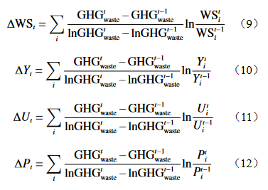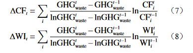 在時(shí)間跨度段 [t-1,t] 內,設 ΔGHGwaste 為溫室氣體排放變化量,ΔCF、ΔWS、ΔWI、ΔY、ΔU、ΔP 分別為 CFt、WSt、WIt、Yt、Ut、Pt 對 ΔGHGwaste 的貢獻 ,利用LMDI 加和分解法得到計算公式如下: