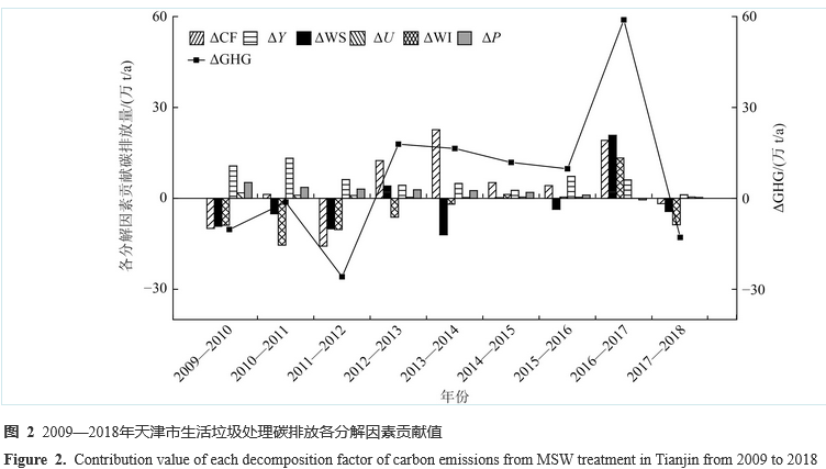 2012—2018年,ΔWS貢獻值變?yōu)檎?,在貢獻值為正值的影響因素中排第5位,對天津市生活垃圾處理碳排放增加貢獻率為0.78%,驅動(dòng)效應較弱。這是因為生活垃圾處理碳排放量在受到處置結構影響的同時(shí),也受到生活垃圾處理量的影響,2012—2018年,天津市生活垃圾填埋處理量和焚燒處理量相差不大,占比分別為47%和44%,填埋處理量的減少在一定程度上降低了溫室氣體的排放,但在此時(shí)間段生活垃圾產(chǎn)生量大幅增長(cháng),同2012年相比,2018年生活垃圾產(chǎn)生量增加了93.10萬(wàn)t,增長(cháng)率為50.2%,由生活垃圾增加量帶來(lái)的溫室氣體排放削弱了廢物處置結構變化產(chǎn)生的抑制作用。