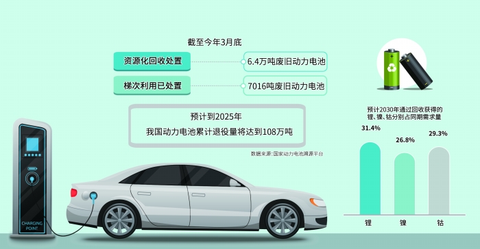據國家動(dòng)力電池溯源平臺數據分析,截至今年3月底,我國再生利用企業(yè)已資源化回收處置6.4萬(wàn)噸廢舊動(dòng)力電池,梯次利用已處置7016噸廢舊動(dòng)力電池,并以此生產(chǎn)了780MWh的梯次產(chǎn)品。與此同時(shí),基于動(dòng)力電池產(chǎn)銷(xiāo)量和生命周期,預計到2025年我國動(dòng)力電池累計退役量將達到108萬(wàn)噸。