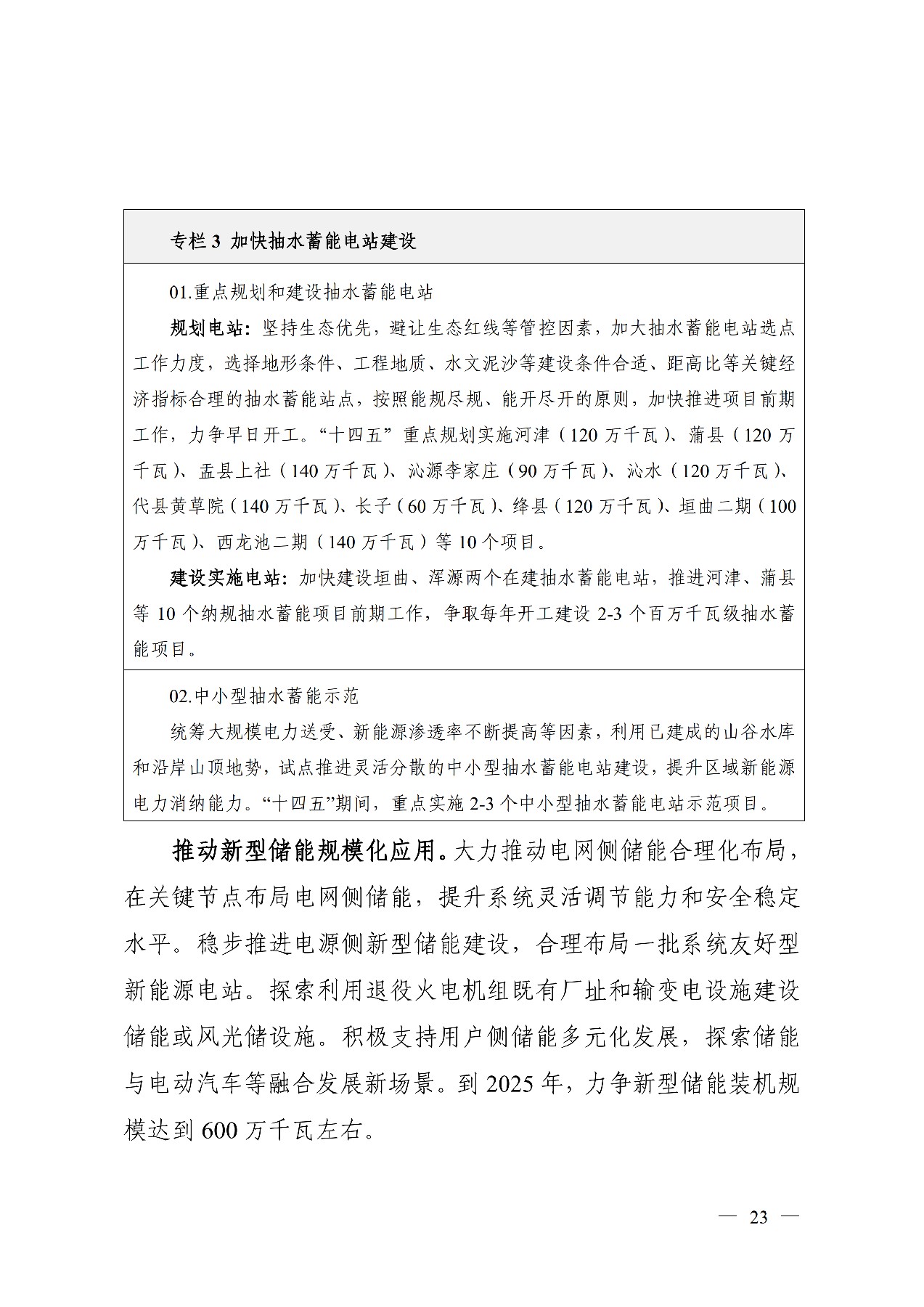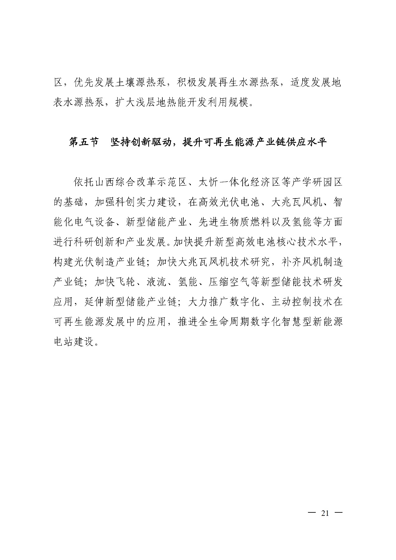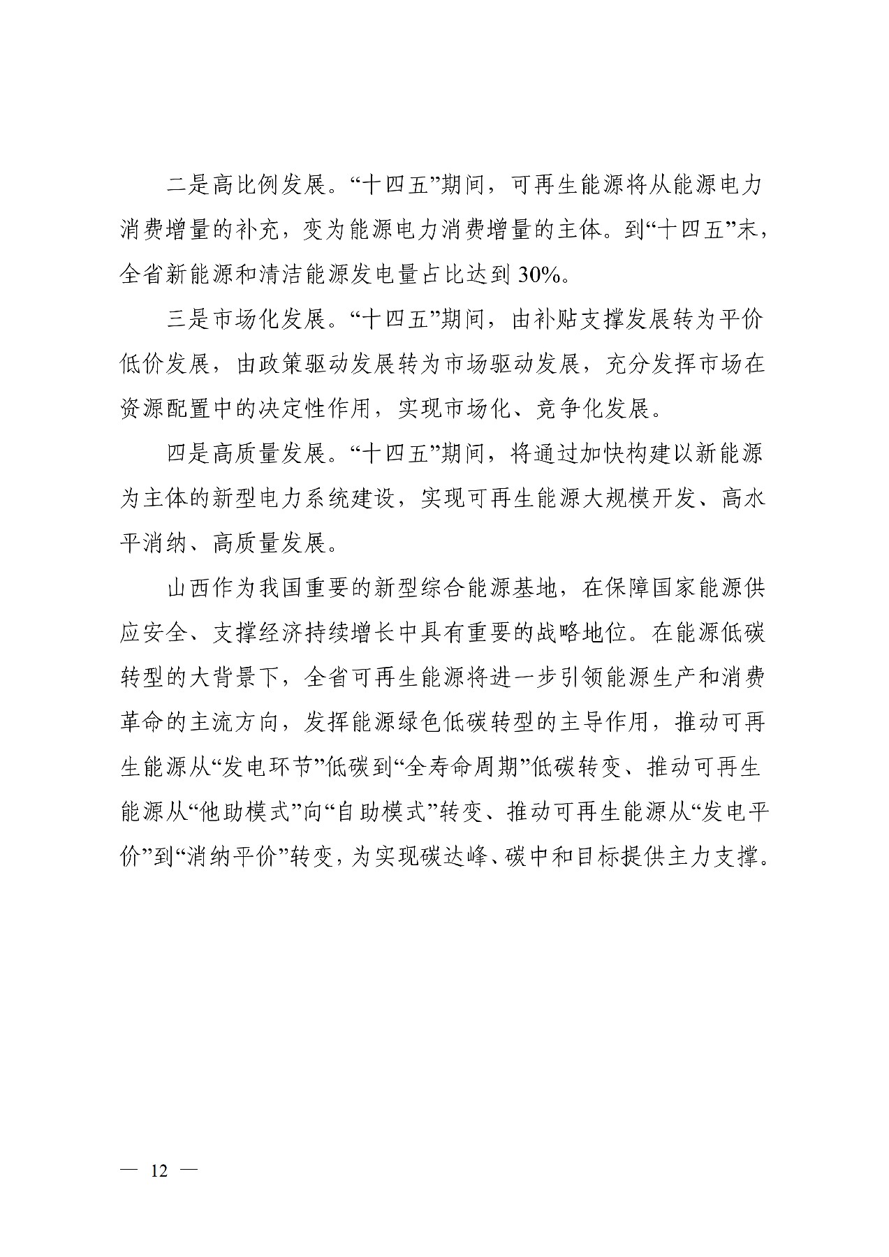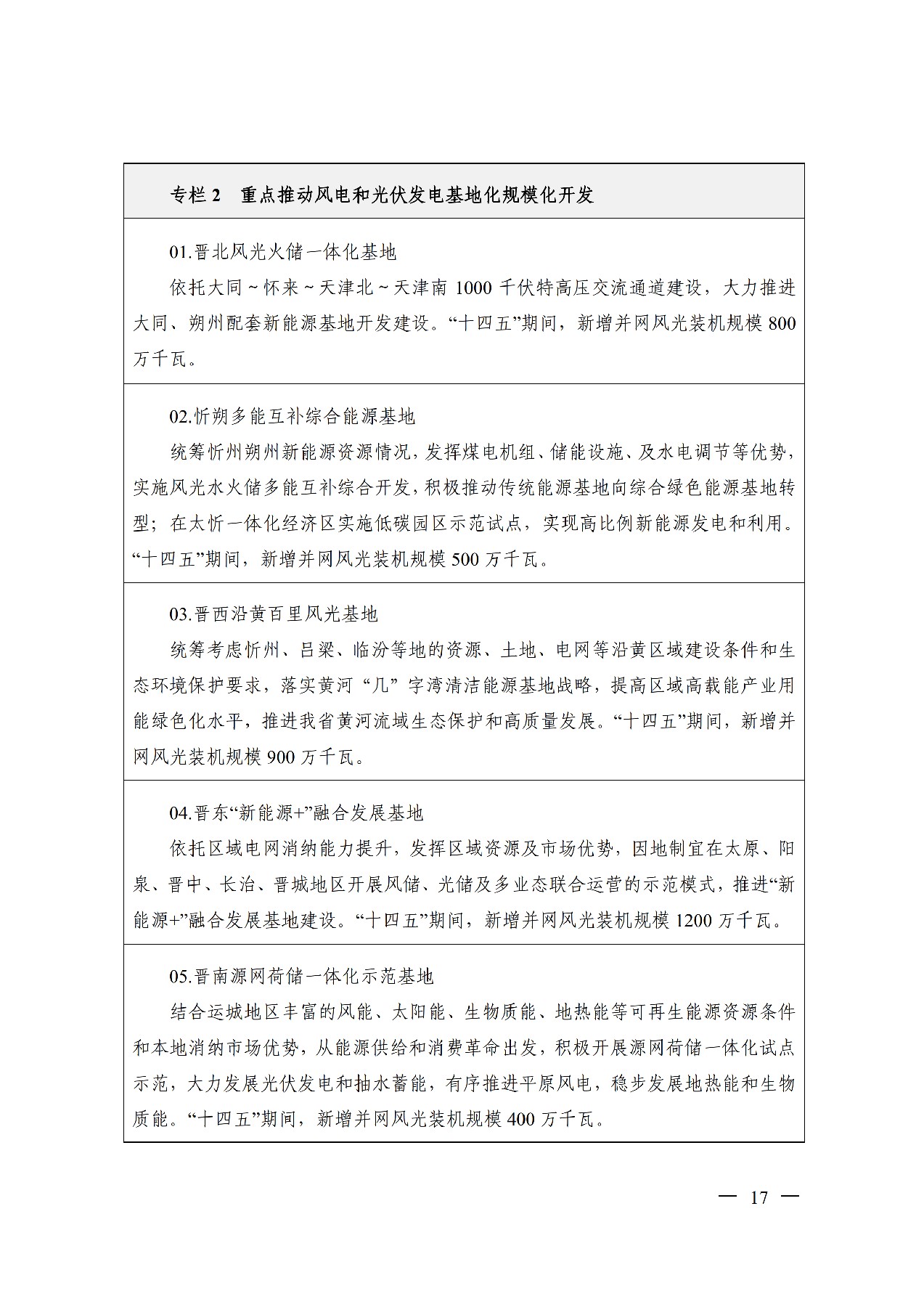 10月8日,山西省發(fā)展和改革委員會(huì )山西省能源局印發(fā)《山西省可再生能源發(fā)展”十四五“規劃》?!兑巹潯诽岢?,到2025年,全省可再生能源發(fā)電裝機達到8300萬(wàn)千瓦以上。 其中,風(fēng)電3000萬(wàn)千瓦左右、光伏5000萬(wàn)千瓦左右、水電(含抽蓄)224萬(wàn)千瓦以上、生物質(zhì)發(fā)電100萬(wàn)千瓦以上,新型儲能裝機將達到600萬(wàn)千瓦左右,實(shí)現新能源和清潔能源裝機容量占比達到50%的目標。到2030年,全省新能源和清潔能源裝機容量占比達到 60%以上。