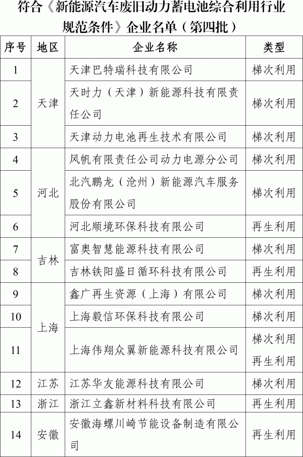 再生利用15家企業(yè),包括河北順境環(huán)??萍?、吉林鐵陽(yáng)盛日循環(huán)、上海偉翔眾翼新能源、安徽海螺川崎節能、南都華鉑新材、贛州騰遠鈷業(yè)、河南科隆電源、駱駝集團資源循環(huán)襄陽(yáng)、湖南天泰天潤新能源等。