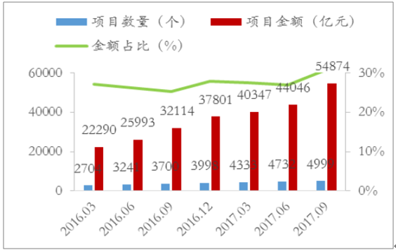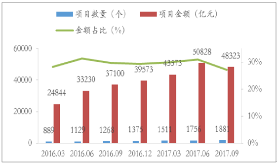 財政部PPP項目數量/投資額統計(截止2017年9月末)