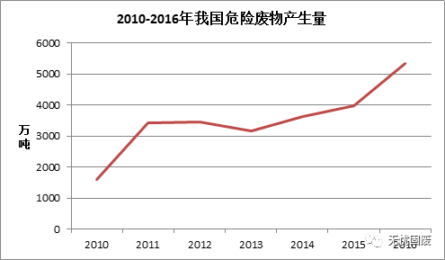? ? 工業(yè)行業(yè)是我國危險廢物的主要來(lái)源,根據2017中國統計年鑒顯示,2016年全國工業(yè)危險廢物產(chǎn)生量為5347.3萬(wàn)噸,同比增長(cháng)34.49%。