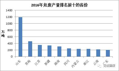 ? ? 其中山東危廢產(chǎn)生量最多,高達1188.28萬(wàn)噸,其次是青海,產(chǎn)生量為462.05萬(wàn)噸,江蘇危廢產(chǎn)生量為350.98萬(wàn)噸,排名第三。