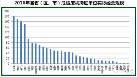 ? ? 截至2016年,全國危險廢物經(jīng)營(yíng)持證單位共2195家,核準經(jīng)營(yíng)規模達到6471萬(wàn)噸,平均每家約2.9萬(wàn)噸。但實(shí)際經(jīng)營(yíng)規模為1629萬(wàn)噸,平均每家不足0.75萬(wàn)噸。實(shí)際經(jīng)營(yíng)規模排在前三位的分別是浙江、山東和廣東。
