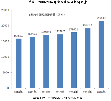 ? ? 中投顧問(wèn)發(fā)布的《2018-2022年中國生活垃圾處理行業(yè)深度調研及投資前景預測報告》數據顯示:2016全國生活垃圾清運量約為21500.5萬(wàn)噸。