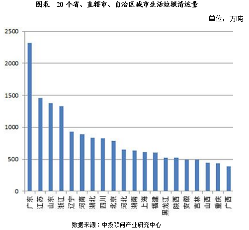 ? ? 廣東省、江蘇省、山東省的生活垃圾清運量位居全國前三位,分別達2320.4萬(wàn)噸、1456.07萬(wàn)噸和1377.49萬(wàn)噸,而浙江省的垃圾清運量?jì)H比山東省少45萬(wàn)噸,而屈居第四位,其余27個(gè)省級行政區域垃圾清運量均未超過(guò)千萬(wàn)噸大關(guān)。廣東、江蘇、山東、浙江四省的生活垃圾清運量達6486.62萬(wàn)噸,占全國生活垃圾清運量的33.89%。