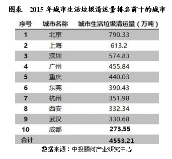 ? ? 在全國661個(gè)設市城市中,生活垃圾清運量前三名的城市分別為北京市、上海市和深圳市,分別為790.33萬(wàn)噸、613.2萬(wàn)噸和574.83萬(wàn)噸。前十名城市的生活垃圾清運量達4553.21萬(wàn)噸,占全國城市生活垃圾清運量的23.79%。排名前十的城市垃圾清運量見(jiàn)下表。
