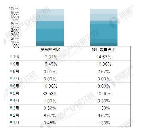 ? ? 分月度來(lái)看,5月份公布的建設項目最多,共有30個(gè)、22.2億元投資額的在建、擬建項目,項目數量、投資額占比分別為40%、33.53%;7月無(wú)新建項目,1月、4月、8月投資額均不到1億元。