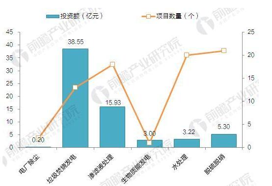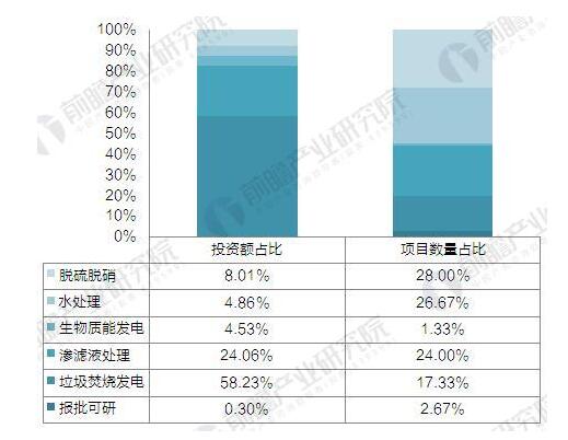 ? ? 從項目細分領(lǐng)域來(lái)看,脫硝脫硫領(lǐng)域的建設項目最多,共有21個(gè)在建、擬建項目,占比達28%;垃圾焚燒發(fā)電領(lǐng)域共有13個(gè)項目,但投資額達到38.55億元,占投資額的比重為58.23%;滲濾液處理領(lǐng)域的項目數量共18個(gè),僅次于脫硝脫硫和水處理,投資額為15.93億元。