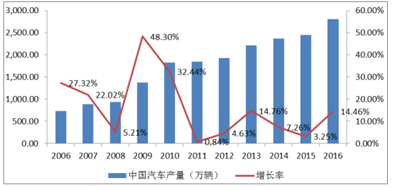 ? ? 近年來(lái),以中國為代表的發(fā)展中國家的汽車(chē)行業(yè)發(fā)展迅速,從 2001年到 2008年,中國汽車(chē)工業(yè)產(chǎn)銷(xiāo)平均每年跨越一個(gè) 100 萬(wàn)輛臺階。2009 年我國新車(chē)產(chǎn)銷(xiāo)量躍居世界第一,并保持至今,汽車(chē)工業(yè)已毫無(wú)爭議地成為我國國民經(jīng)濟的支柱產(chǎn)業(yè)。中國的汽車(chē)產(chǎn)量在 2014 年、2015 年和 2016 年分別為2,372.29 萬(wàn)輛、2,450.33 萬(wàn)輛、2,811.88 萬(wàn)輛,同比分別增長(cháng) 7.26% 、3.25% 和14.46%。