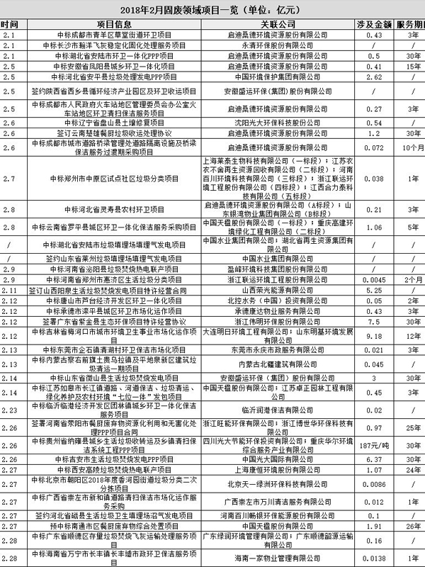 ? ? 據中國固廢網(wǎng)不完全統計,2018年1月固廢領(lǐng)域落地的項目高達55個(gè),涉及總金額逾120億元(詳情請點(diǎn)擊:1月固廢市場(chǎng)盤(pán)點(diǎn):55個(gè)項目落定,涉及金額逾120億元)。2018年2月,即使處在春節放假期間,固廢領(lǐng)域落地的項目也足有37個(gè),涉及金額超過(guò)43.91億元。其中包括垃圾分類(lèi)項目3個(gè)、垃圾焚燒發(fā)電項目7個(gè)、環(huán)衛項目15個(gè)、土壤修復項目1個(gè)、餐廚處理項目3個(gè)、垃圾清運項目3個(gè)、飛灰處理項目2個(gè)以及垃圾填埋場(chǎng)項目3個(gè)。另外,統計內,本月沒(méi)有釋放危廢處理項目。