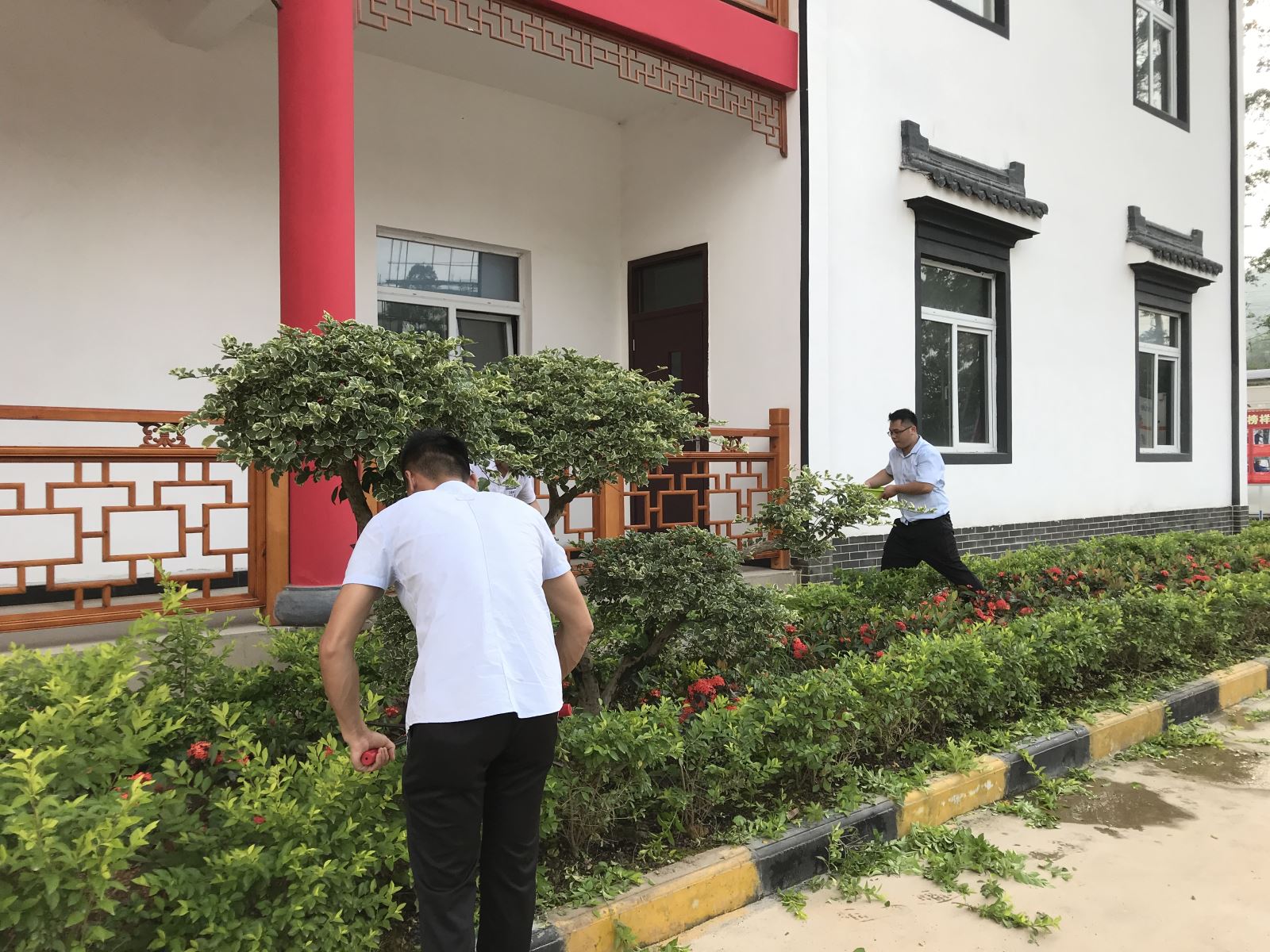 ? ? 另一組員工至公司辦公樓、生活區2#、3#樓集體宿舍宿舍進(jìn)行綠化帶修剪及除草、拔草,對綠化苗木進(jìn)行日常管養,提高綠化景觀(guān)效果。
